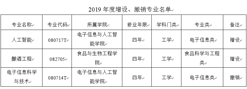 近日,教育部公布了《2019年度普通高等學校本科專業(yè)備案和審批結(jié)果的通知》(教高函〔2020〕2號),我校人工智能(080717T)、釀酒工程(082705)2個本科專業(yè)獲得教育部批準設置,可從2020年開始招生。申報撤銷的電子信息科學與技術(shù)(080714T)本科專業(yè),從2020年停招。