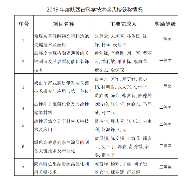 我校共有7項(xiàng)科研成果獲得獎(jiǎng)勵(lì),其中一等獎(jiǎng)3項(xiàng),二等獎(jiǎng)3項(xiàng),三等獎(jiǎng)1項(xiàng)。我校張美云教授等完成的“粉煤灰基硅酸鈣高填料造紙關(guān)鍵技術(shù)及應(yīng)用”,黃劍鋒教授等完成的“高強(qiáng)度大規(guī)格陶瓷薄板的關(guān)鍵制造及其表面功能化裝飾技術(shù)”,陳合教授等參與完成的“奶山羊產(chǎn)業(yè)高質(zhì)量發(fā)展關(guān)鍵技術(shù)研究與應(yīng)用”,成果獲得陜西省科學(xué)技術(shù)獎(jiǎng)一等獎(jiǎng),“高性能金屬磷化物及其改性?xún)?chǔ)能材料”等3項(xiàng)成果獲得二等獎(jiǎng),“陜西特色果品資源高值化利用關(guān)鍵技術(shù)”等1項(xiàng)成果獲得三等獎(jiǎng)。
