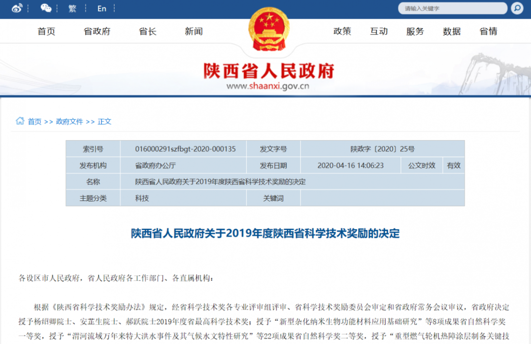 根據(jù)《陜西省科學(xué)技術(shù)獎(jiǎng)勵(lì)辦法》規(guī)定,經(jīng)省科學(xué)技術(shù)獎(jiǎng)各專(zhuān)業(yè)評(píng)審組評(píng)審、省科學(xué)技術(shù)獎(jiǎng)勵(lì)委員會(huì)審定和省政府常務(wù)會(huì)議審議,省政府決定授予楊紹卿院士、安芷生院士、郝躍院士2019年度省最高科學(xué)技術(shù)獎(jiǎng);授予“新型雜化納米生物功能材料應(yīng)用基礎(chǔ)研究”等8項(xiàng)成果省自然科學(xué)獎(jiǎng)一等獎(jiǎng),授予“渭河流域萬(wàn)年來(lái)特大洪水事件及其氣候水文特性研究”等22項(xiàng)成果省自然科學(xué)獎(jiǎng)二等獎(jiǎng),授予“重型燃?xì)廨啓C(jī)熱障涂層制備關(guān)鍵技術(shù)與評(píng)價(jià)方法及應(yīng)用”等12項(xiàng)成果省技術(shù)發(fā)明獎(jiǎng)一等獎(jiǎng),授予“鐵錳復(fù)合氧化物催化氧化同步去除水中氨氮/錳關(guān)鍵技術(shù)”等9項(xiàng)成果省技術(shù)發(fā)明獎(jiǎng)二等獎(jiǎng),授予“車(chē)載智能終端網(wǎng)聯(lián)感知與接入關(guān)鍵技術(shù)及其產(chǎn)業(yè)化”等28項(xiàng)成果省科學(xué)技術(shù)進(jìn)步獎(jiǎng)一等獎(jiǎng),授予“蘋(píng)果采后質(zhì)量控制關(guān)鍵技術(shù)創(chuàng)制及產(chǎn)業(yè)化集成應(yīng)用”58項(xiàng)成果省科學(xué)技術(shù)進(jìn)步獎(jiǎng)二等獎(jiǎng),授予“油田用非金屬管全尺寸試驗(yàn)評(píng)價(jià)新技術(shù)及裝備開(kāi)發(fā)”等122項(xiàng)成果省科學(xué)技術(shù)進(jìn)步獎(jiǎng)三等獎(jiǎng),授予科勒博(KLEBERA.SERNIK)先生陜西省國(guó)際科學(xué)技術(shù)合作獎(jiǎng)。