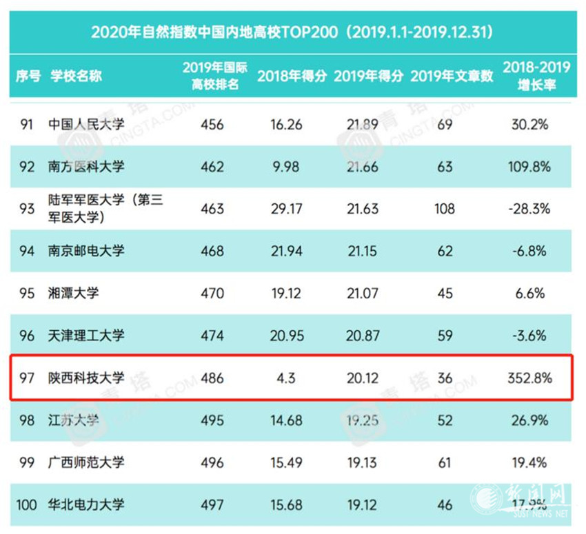 4月30日,自然指數(shù)網(wǎng)站發(fā)布2020自然指數(shù)年度榜單(Nature Index 2020 annual tables),展示了2019年度不同國家和科研機構(gòu)在自然科學(xué)領(lǐng)域高質(zhì)量科研產(chǎn)出的情況。我校位列全球高校第486位,較2019年度榜單第1130位上升644位;位列內(nèi)地高校第97位,較2019年度榜單第199位上升102位;貢獻份額增長率為352.8%。居省屬高校第2名,輕工類高校第2名。為我校在自然指數(shù)年度榜單中的歷史最好成績,表現(xiàn)出我校在自然科學(xué)領(lǐng)域強勁的發(fā)展勢頭。