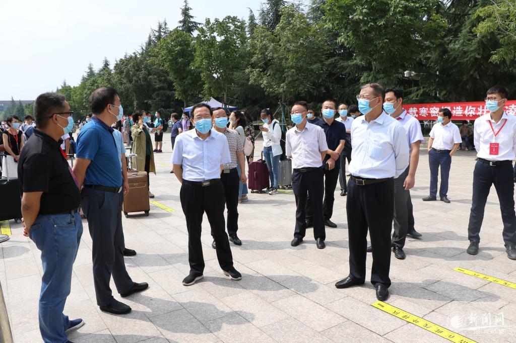 在迎新大道各學院學生報到點,姚書志與返校學生親切交談,向有關負責人了解全面恢復教育教學秩序及疫情防控工作開展情況;李志健聽取了教務處、學生處負責人就開學準備和學生返校工作開展情況的現(xiàn)場匯報。