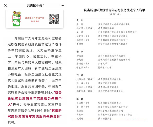 憑借出色的工作表現(xiàn)和舍我其誰的責(zé)任擔(dān)當(dāng),魏瑤瑤在2020年榮獲陜西省青年志愿者協(xié)會疫情防控“高級志愿者”、紅色青春志愿服務(wù)中心抗擊疫情“優(yōu)秀工作者”等多項榮譽稱號。