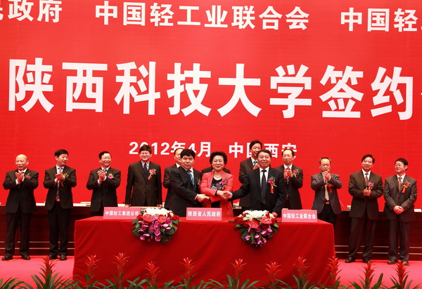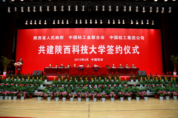為了深入貫徹落實(shí)《國(guó)家中長(zhǎng)期教育改革和發(fā)展規(guī)劃綱要(2010-2020年)》,大力實(shí)施科教興陜戰(zhàn)略和人才強(qiáng)省戰(zhàn)略,更好地保持和發(fā)揮我校輕化工為主的辦學(xué)特色和學(xué)科優(yōu)勢(shì),全面加強(qiáng)校企合作,積極構(gòu)建輕工行業(yè)科技攻關(guān)支撐平臺(tái),加快推進(jìn)我校高水平、有特色的教學(xué)研究型大學(xué)建設(shè),積極爭(zhēng)取將我校納入“中西部高等教育振興計(jì)劃”, 4月 17日 ,“陜西省人民政府與中國(guó)輕工業(yè)聯(lián)合會(huì)、中國(guó)輕工集團(tuán)公司共建陜西科技大學(xué)簽約儀式”在文體館隆重舉行。