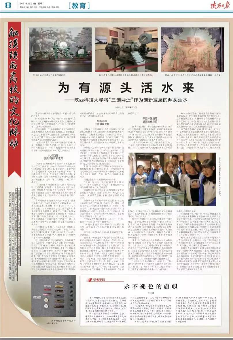 12月1日,《陜西日報》八版以《為有源頭活水來——陜西科技大學(xué)將“三創(chuàng)兩遷”作為創(chuàng)新發(fā)展的源頭活水》為題,整版報道我校西遷歷史、西遷故事和近年來取得的成績。陜西科技大學(xué)作為“西遷群體”之一,在六十多年的發(fā)展歷程中,歷經(jīng)“三次創(chuàng)業(yè)、兩次搬遷、一次劃轉(zhuǎn)”的奮斗與輝煌,秉承以“自強(qiáng)不息、艱苦奮斗的創(chuàng)業(yè)精神,求實創(chuàng)新、銳意進(jìn)取的科學(xué)精神和扎根西部、服務(wù)社會的奉獻(xiàn)精神”為內(nèi)涵的“三創(chuàng)兩遷”精神,培養(yǎng)出一批勇于實踐、善于創(chuàng)新的優(yōu)秀學(xué)子,為國家建設(shè)和社會發(fā)展做出了重要貢獻(xiàn)。全文轉(zhuǎn)載如下: