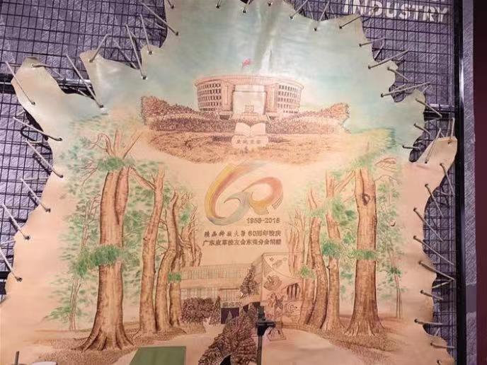 學(xué)校60周年校慶時,廣東皮革校友會捐贈的一整張牛皮上手工烙皮革畫