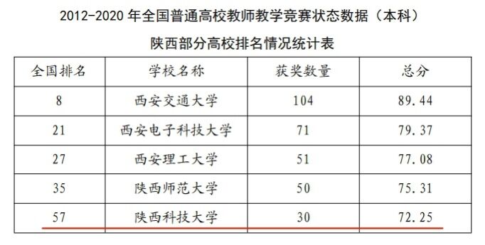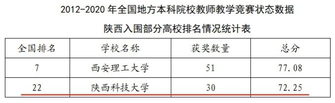 3月22日,中國(guó)高等教育學(xué)會(huì)發(fā)布《全國(guó)普通高校教師教學(xué)競(jìng)賽分析報(bào)告(2012-2020年)》。我校排名全國(guó)高校第57位,位居陜西省屬高校第2位。