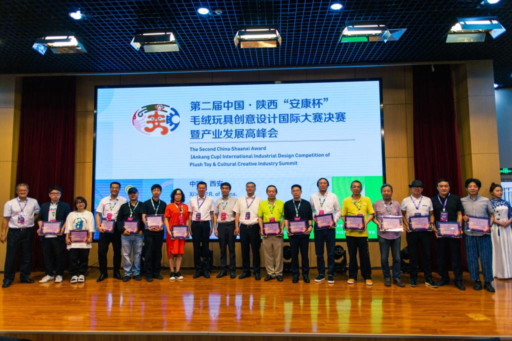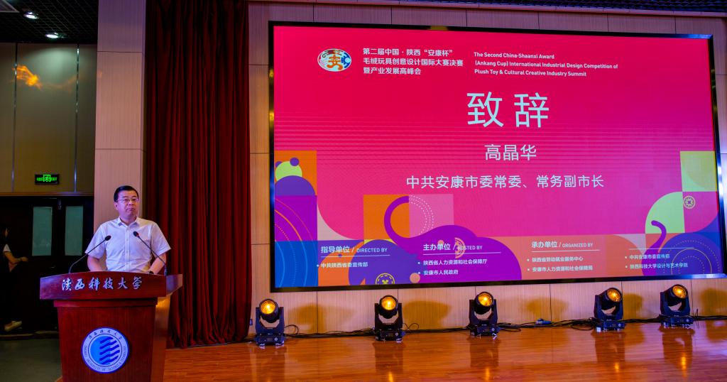 6月10日,第二屆中國·陜西“安康杯”毛絨玩具創(chuàng)意設(shè)計(jì)國際大賽決賽及頒獎(jiǎng)典禮在陜西科技大學(xué)西安校區(qū)隆重舉行。中共安康市委副書記、市長趙俊民,人力資源和社會保障部職業(yè)能力建設(shè)司副司長朱利民,中國玩具和嬰童用品協(xié)會會長梁梅,中共陜西省委宣傳部副部長柯昌萬,陜西省人力資源和社會保障廳副廳長井海濱,中共陜西省委宣傳部二級巡視員雎勵(lì)軍,中共陜西省委宣傳部文產(chǎn)辦主任魯吉安,中共安康市委常委、常務(wù)副市長高晶華,安康市人大常委會副主任陳倫寶,陜西科技大學(xué)黨委書記姚書志,校長李志健,副校長黃劍鋒,中共安康市委宣傳部常務(wù)副部長周繼林,安康市人力資源和社會保障局局長汪小衛(wèi)和陜西美協(xié)主席郭線廬,中國傳媒大學(xué)動(dòng)畫與數(shù)字藝術(shù)學(xué)院院長黃心淵,西北工業(yè)大學(xué)工業(yè)設(shè)計(jì)研究所所長余隋懷,浙江大學(xué)現(xiàn)代工業(yè)設(shè)計(jì)研究所所長孫守遷,湖南大學(xué)設(shè)計(jì)藝術(shù)學(xué)院院長季鐵,深圳優(yōu)泰文創(chuàng)運(yùn)營發(fā)展有限公司董事長李克克出席大賽決賽及頒獎(jiǎng)典禮。
