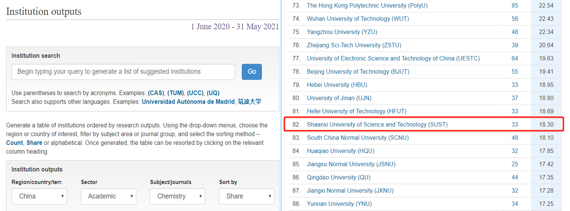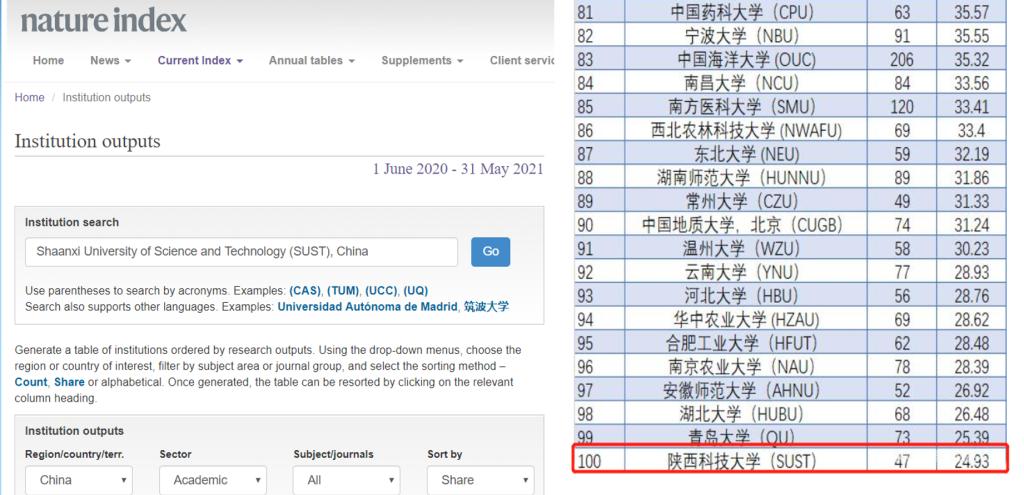 2021年10月,Nature指數(shù)更新了最新一期全球?qū)W術(shù)排名,數(shù)據(jù)統(tǒng)計時間為:2020年6月1日到2021年5月31日。按照貢獻(xiàn)度排名,陜西科技大學(xué)排名中國高校第100位,文章數(shù)47篇,貢獻(xiàn)度24.93;我?;瘜W(xué)學(xué)科排名穩(wěn)居中國高校第82位,文章數(shù)33篇,貢獻(xiàn)度18.30。此次排名展示了我校在自然科學(xué)領(lǐng)域持續(xù)高質(zhì)量的科研產(chǎn)出情況。