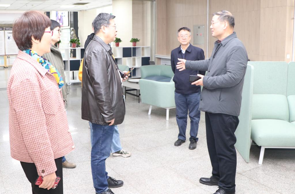 校長李志健(右一)在休閑閱讀區(qū)談圖書館建設(shè)發(fā)展