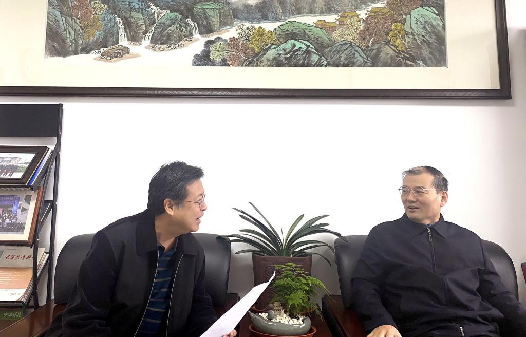 校長李志健(右)在辦公室接受圖書館館長王海剛采訪