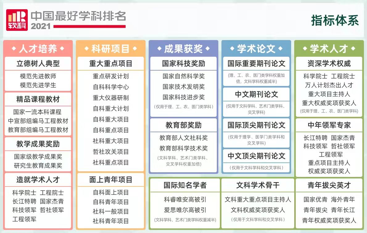 軟科“中國(guó)最好學(xué)科排名”源自服務(wù)于高校學(xué)科建設(shè)管理部門(mén)的學(xué)科發(fā)展水平動(dòng)態(tài)監(jiān)測(cè)數(shù)據(jù)系統(tǒng),2017年開(kāi)始計(jì)算學(xué)科綜合排名并對(duì)外公開(kāi)發(fā)布。軟科中國(guó)最好學(xué)科排名的指標(biāo)體系包括人才培養(yǎng)、科研項(xiàng)目、成果獲獎(jiǎng)、學(xué)術(shù)論文、學(xué)術(shù)人才五個(gè)指標(biāo)類(lèi)別,使用50余項(xiàng)學(xué)科建設(shè)管理中密切關(guān)注的量化指標(biāo),強(qiáng)調(diào)通過(guò)客觀數(shù)據(jù)反映學(xué)科點(diǎn)對(duì)本學(xué)科稀缺資源和標(biāo)志性成果的占有和貢獻(xiàn),學(xué)科口徑是教育部最新《學(xué)位授予和人才培養(yǎng)學(xué)科目錄》中的一級(jí)學(xué)科,學(xué)科排名在不同學(xué)科采用差異化的指標(biāo)體系。
