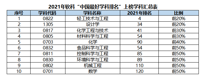 輕工技術(shù)與工程、設(shè)計(jì)學(xué)排名首次進(jìn)入前20%,材料科學(xué)與工程、化學(xué)工程與技術(shù)排名前30%,化學(xué)排名前40%,數(shù)學(xué)、機(jī)械工程、控制科學(xué)與工程、環(huán)境科學(xué)與工程、食品科學(xué)與工程排名前50%。