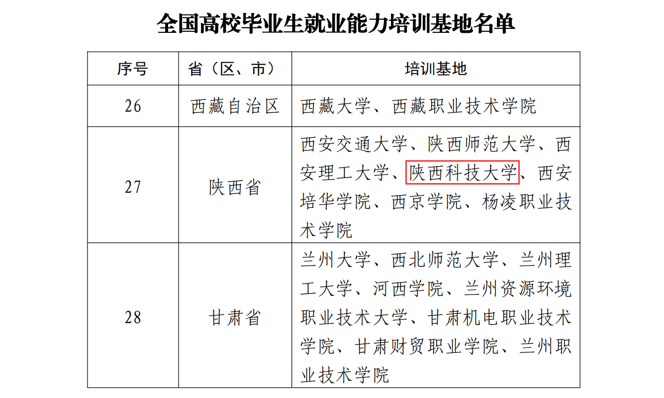 近日,教育部公布首批135所“全國(guó)高校畢業(yè)生就業(yè)能力培訓(xùn)基地”名單,陜西省共有7所高校入選,陜西科技大學(xué)位列其中。