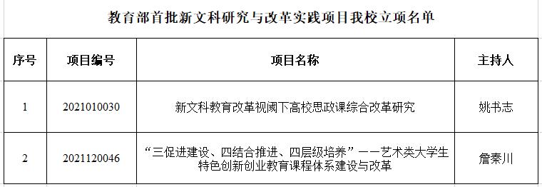 近日,教育部《關(guān)于公布首批新文科研究與改革實(shí)踐項(xiàng)目的通知》發(fā)布,我校姚書(shū)志教授主持的“新文科教育改革視閾下高校思政課綜合改革研究”、詹秦川教授主持的“‘三促進(jìn)建設(shè)、四結(jié)合推進(jìn)、四層級(jí)培養(yǎng)’——藝術(shù)類大學(xué)生特色創(chuàng)新創(chuàng)業(yè)教育課程體系建設(shè)與改革”2個(gè)項(xiàng)目獲批立項(xiàng),立項(xiàng)數(shù)量居陜西省屬高校第二。