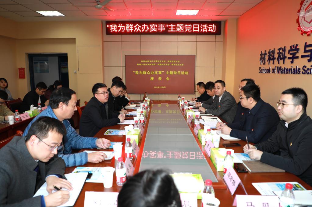 為深入開展“我為群眾辦實(shí)事”實(shí)踐活動(dòng),加強(qiáng)教育行政部門與高校聯(lián)動(dòng)機(jī)制,11月9日,陜西省教育廳發(fā)展規(guī)劃處黨支部、高等教育處黨支部與我校材料科學(xué)與工程學(xué)院黨委、發(fā)展規(guī)劃處黨支部、教務(wù)處黨支部聯(lián)合開展“我為群眾辦實(shí)事”主題黨日活動(dòng)。省委教育工委、省教育廳二級(jí)巡視員高巍、發(fā)展處處長(zhǎng)胡海寧、高教處處長(zhǎng)高強(qiáng),陜西科技大學(xué)黨委副書記郭強(qiáng)全程參加本次活動(dòng)。