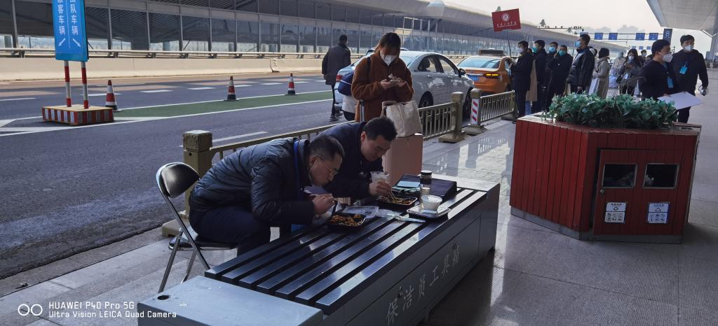 送一程,再送一程,在北客站出發(fā)平臺呼嘯的寒風(fēng)中,校長李志健、化工學(xué)院黨委書記張巖、黨校辦副主任李述麟在路邊的長椅上吃完了冰冷的一餐。一輛陜科大的擺渡大巴剛到站,他們又放下盒飯,起來送又一批學(xué)子進(jìn)站。