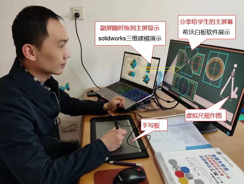 在為本科生講授《工程制圖》時,他采用希沃白板軟件作為授課軟件,以這塊“黑板”作為背景,需要推導和演算的,就用手寫板在“黑板”一筆筆寫出“板書”;需要展示作圖過程的,就用“虛擬尺規(guī)”軟件,把作圖過程一步步“畫”出來;需要再現(xiàn)零件建模和裝配全過程的,就把三維建模軟件Solidworks從輔助屏拖到“黑板”上實操展示。