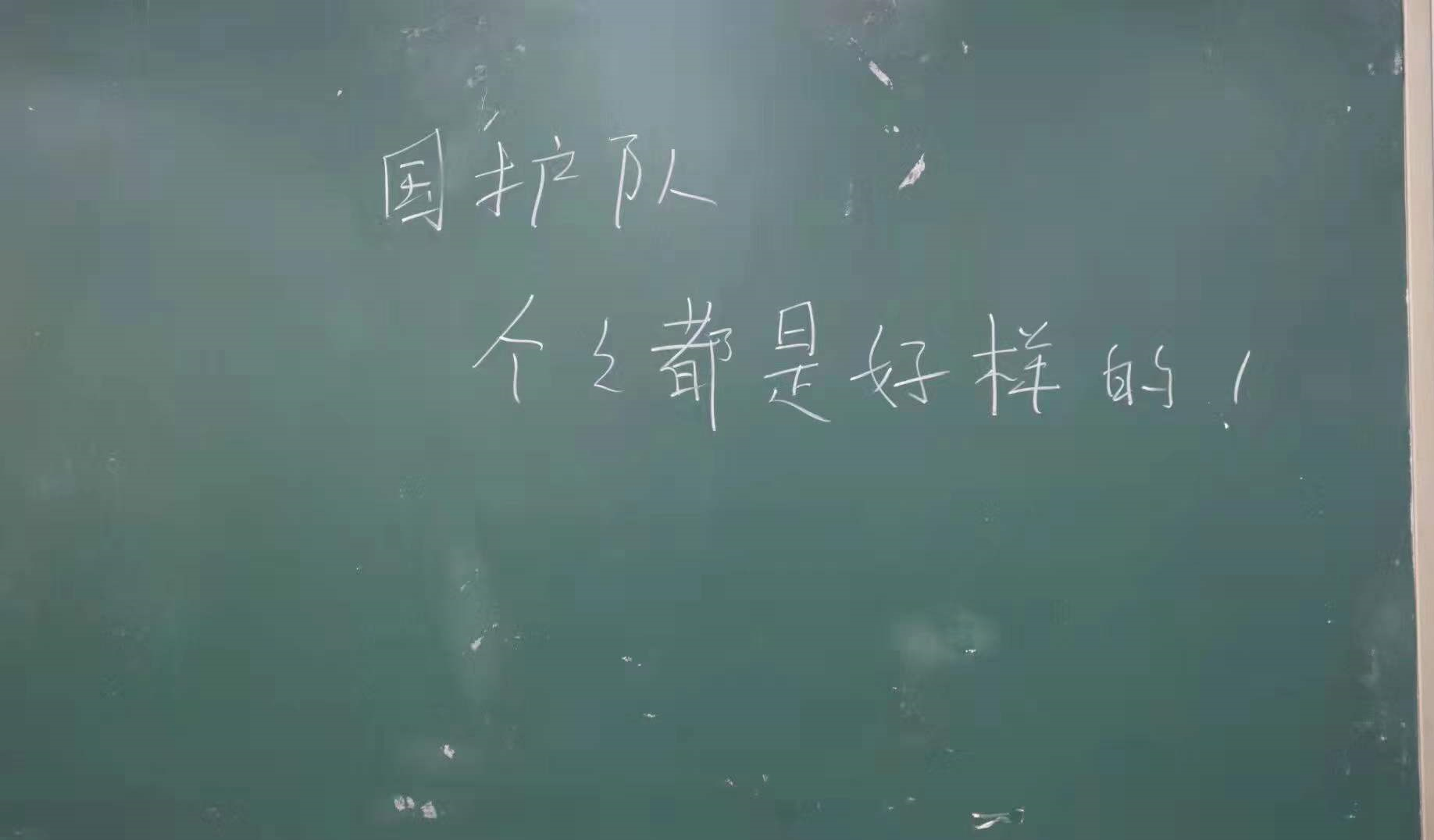 12月25日中午,一號教學(xué)樓F座的教室內(nèi),執(zhí)行2022年全國碩士研究生招生考試陜西科技大學(xué)考點(diǎn)執(zhí)勤任務(wù)的國旗護(hù)衛(wèi)隊(duì)隊(duì)員們,正利用短暫的午休時(shí)間匆匆吃著盒飯,正在教室休息的一位監(jiān)考老師突然起身走向黑板,拿起粉筆用力寫下一行大字——“國護(hù)隊(duì)個(gè)個(gè)都是好樣的!”,抬頭看到這句話,不少隊(duì)員眼中都淚花閃爍。