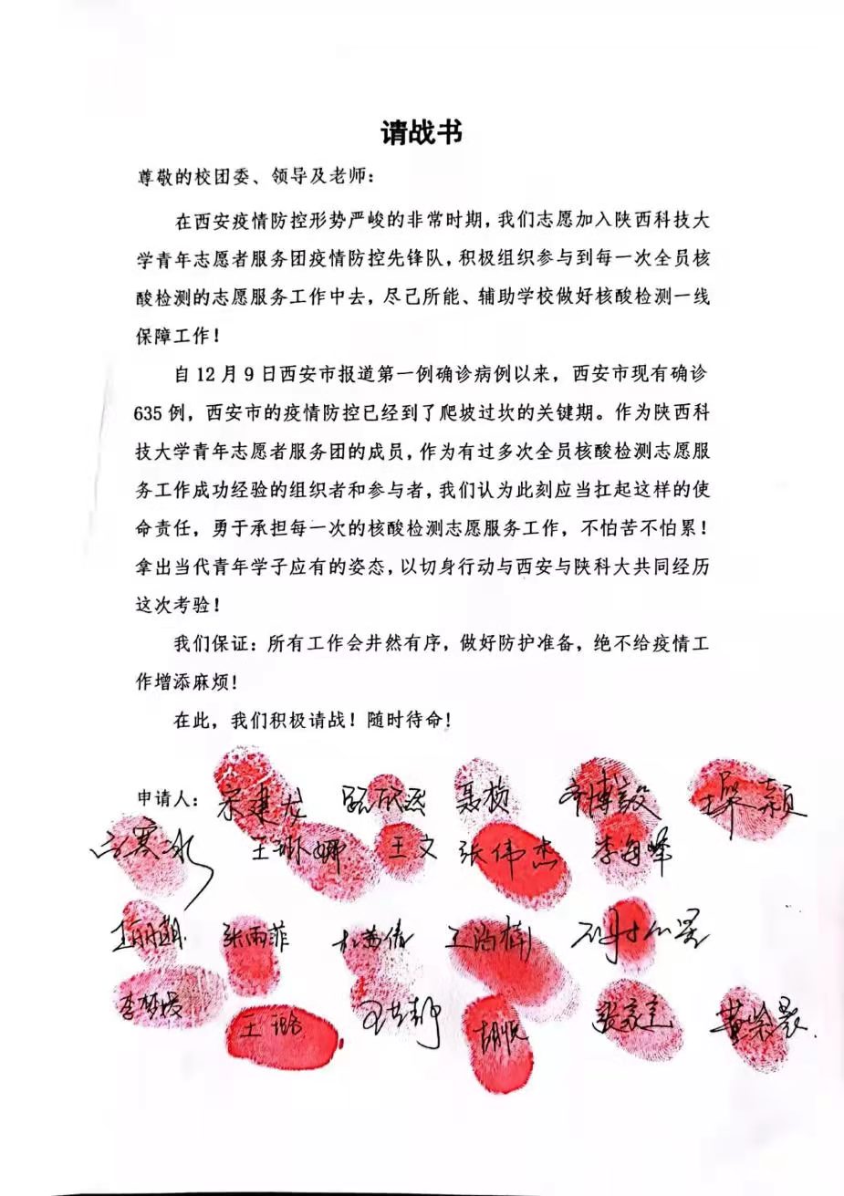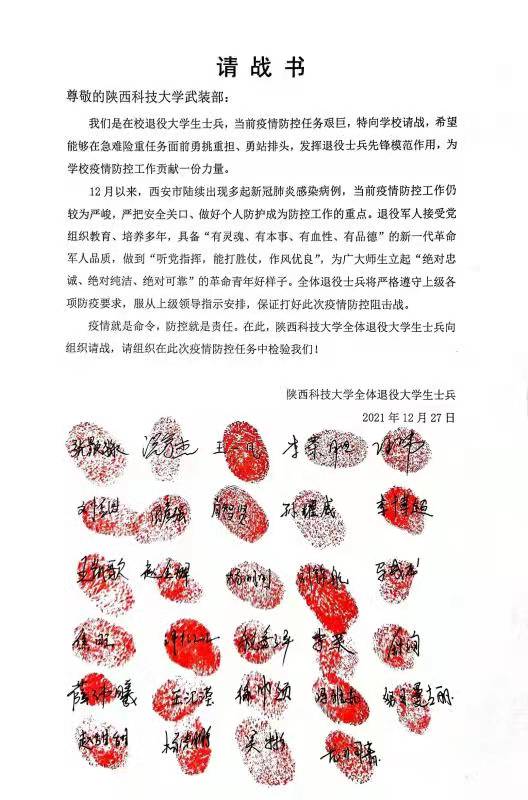 12月27日,隨著西安市進(jìn)一步強(qiáng)化疫情防控措施,學(xué)校武裝部收到了一張按滿“紅手印”的請戰(zhàn)書,這是我校29名退役大學(xué)生士兵向?qū)W校提出的莊嚴(yán)申請。