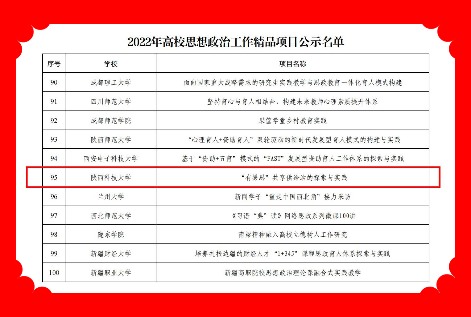 近日,教育部思想政治工作司公布了2022年度高校思想政治工作有關(guān)培育建設(shè)項目遴選結(jié)果,我校姚書志教授主持的網(wǎng)絡(luò)育人項目《“有易思”共享供給站的探索與實踐》成功入選高校思想政治工作精品項目(全國100項,陜西僅有3所高校入選),實現(xiàn)我校在高校思想政治工作領(lǐng)域頂級項目申報的新突破。