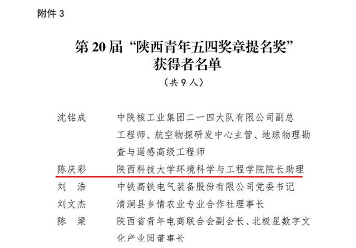在建團百年之際,為充分發(fā)揮青年典型模范帶頭作用,激勵全省廣大青年心懷“國之大者”,奮勇建功立業(yè),以優(yōu)異成績迎接黨的二十大勝利召開,共青團陜西省委、陜西省青年聯(lián)合會授予70名同志“陜西青年五四獎章”、25個青年集體“陜西青年五四獎章集體”、9名同志“陜西青年五四獎章提名獎”、10個青年集體“陜西青年五四獎章集體提名獎”,我校環(huán)境科學與工程學院青年教師陳慶彩榮獲第二十屆“陜西青年五四獎章提名獎”。
