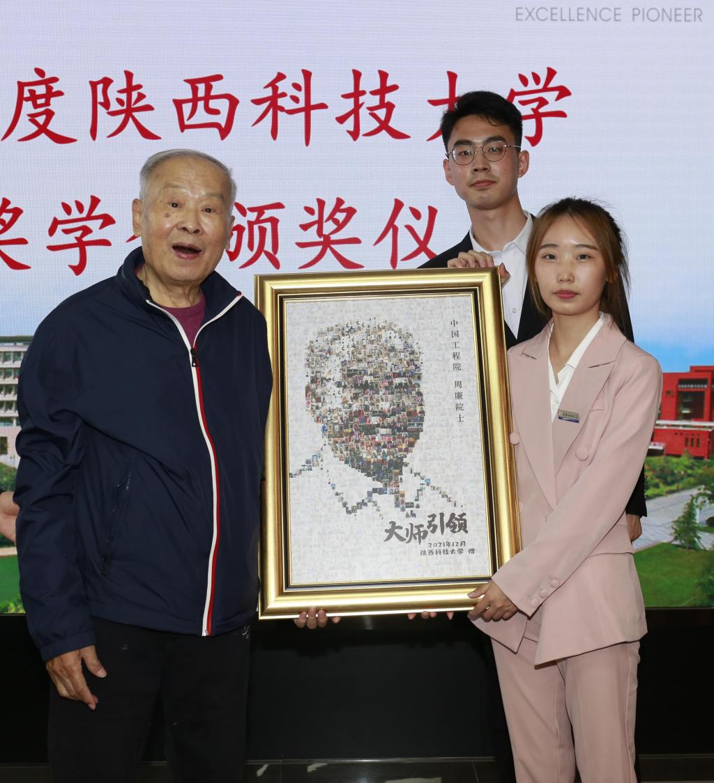 周廉院士為獲獎(jiǎng)學(xué)生一一頒發(fā)證書(shū),并與他們親切合影留念。同學(xué)們用歷年獲獎(jiǎng)?wù)掌谱鞯男は褡鳛榧o(jì)念品贈(zèng)送給周廉院士,以此表達(dá)心中感激之情。