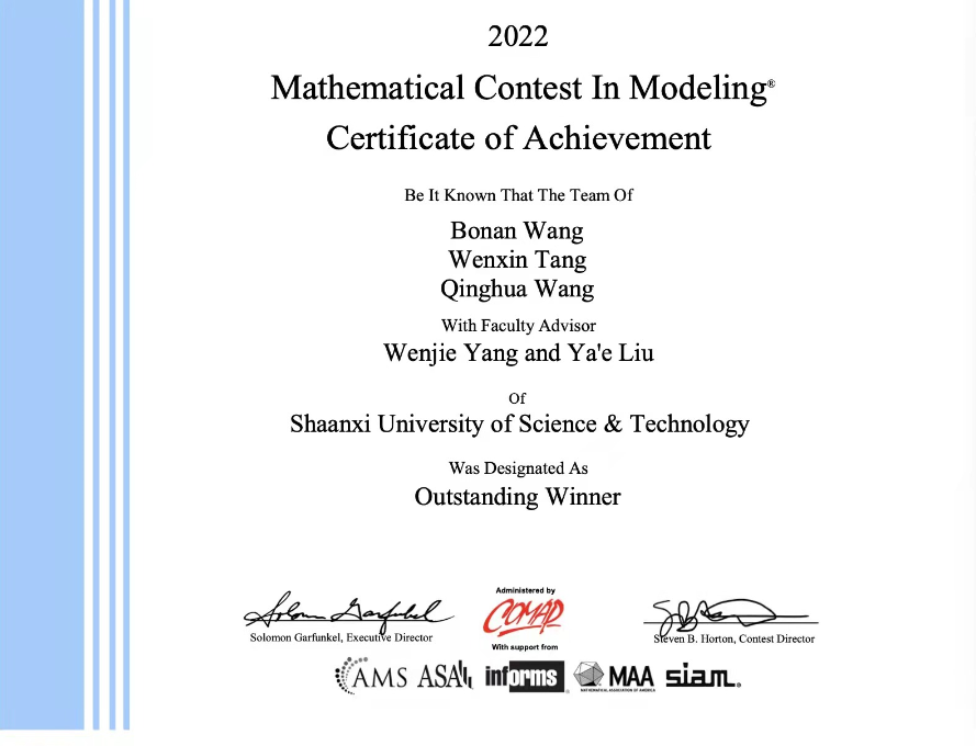 近日,2022年美國大學生數(shù)學建模競賽(MCM/ICM)成績正式揭曉,我校獲得特等獎1項、二等獎3項、三等獎5項的優(yōu)異成績。數(shù)學與數(shù)據(jù)科學學院王博楠、唐文心、王清華三位同學組建的團隊為我校首次獲得特等獎(Outstanding)。MCM全球共23個團隊獲得特等獎。