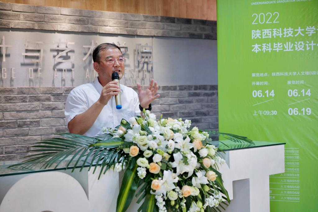 徐晉作為行業(yè)嘉賓代表致辭。他對即將畢業(yè)的2022屆畢業(yè)生表示由衷的祝賀。他表示,今天舉行的畢業(yè)作品展是同學們四年大學生活最精彩的留影,更是同學們大學四年專業(yè)學習的直接見證。在陜科大求學的四年,既是同學們最難忘的青春歲月,也必將是同學們?nèi)松兄匾膴^斗底色,祝愿在場的畢業(yè)生未來都能永遠純粹地盛裝出行。