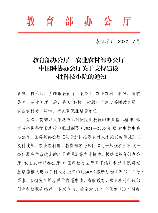科技小院的建設(shè)是深入貫徹習(xí)近平總書(shū)記對(duì)研究生教育的重要指示精神、深化落實(shí)國(guó)家鄉(xiāng)村振興計(jì)劃、推進(jìn)研究生培養(yǎng)模式改革、助力鄉(xiāng)村人才振興的重要舉措。研究生在完成理論知識(shí)學(xué)習(xí)的基礎(chǔ)上,長(zhǎng)期扎根生產(chǎn)一線,研究解決農(nóng)業(yè)農(nóng)村生產(chǎn)實(shí)踐中的實(shí)際問(wèn)題,是人才培養(yǎng)、科技創(chuàng)新、社會(huì)服務(wù)三位一體的人才培養(yǎng)模式。教育部、農(nóng)業(yè)農(nóng)村部、中國(guó)科協(xié)將持續(xù)加大對(duì)科技小院建設(shè)的支持力度,充分發(fā)揮全國(guó)農(nóng)業(yè)專(zhuān)業(yè)學(xué)位研究生教育指導(dǎo)委員會(huì)、中國(guó)農(nóng)村專(zhuān)業(yè)技術(shù)協(xié)會(huì)等專(zhuān)家組織作用,適時(shí)組織專(zhuān)家就科技小院建設(shè)情況進(jìn)行跟蹤指導(dǎo),對(duì)科技小院人才培養(yǎng)成效突出的研究生培養(yǎng)單位,在學(xué)科建設(shè)和研究生教育教學(xué)改革方面給予相應(yīng)支持??萍夹≡喝瞬排囵B(yǎng)質(zhì)量將作為農(nóng)業(yè)專(zhuān)業(yè)學(xué)位授權(quán)點(diǎn)及涉農(nóng)學(xué)位授權(quán)點(diǎn)學(xué)科建設(shè)質(zhì)量評(píng)價(jià)的重要指標(biāo)。