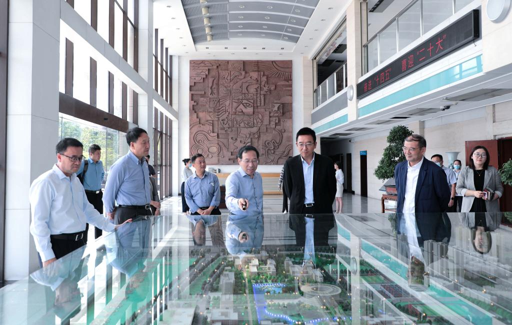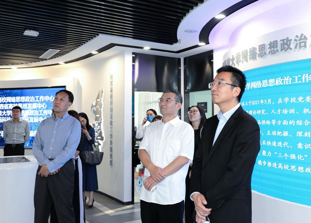 李志健、黃劍鋒陪同蒙震一行先后參觀考察了我校分析測試中心、圖書智慧管理系統(tǒng)、網(wǎng)絡(luò)思想政治工作中心、中心機房及智慧教室的建設(shè)與使用情況。在分析測試中心,蒙震一行參觀了各個重點實驗室,詳細了解了各高精尖儀器設(shè)備的購置背景和用途等情況。圖書館館長王海剛向蒙震一行介紹了智慧圖書館平臺、大數(shù)據(jù)分析系統(tǒng)的建設(shè)情況,現(xiàn)場展示了實時的入館人數(shù)、借閱量、借閱排行等數(shù)據(jù)。在網(wǎng)絡(luò)思想政治工作中心,中心主任李萌詳細介紹了網(wǎng)絡(luò)文明研究中心、優(yōu)質(zhì)網(wǎng)絡(luò)文化精準供給轉(zhuǎn)化中心、精準賦能實踐中心和各個應(yīng)用學(xué)習(xí)平臺的建設(shè)情況。信息與網(wǎng)絡(luò)管理中心主任李健詳細介紹由中國銀行投資的設(shè)備及運行情況。在阿爾斯特學(xué)院,蒙震一行參觀了PBL教室、計算機多用途教室、觀摩室等地,院長薛朝華在研討型互動教室向蒙震一行展示介紹了多屏互動投屏系統(tǒng)。蒙震對我校盤活資金投入教學(xué)科研,改善辦學(xué)條件,提高數(shù)字化國際化辦學(xué)能力的建設(shè)成效予以高度贊譽。