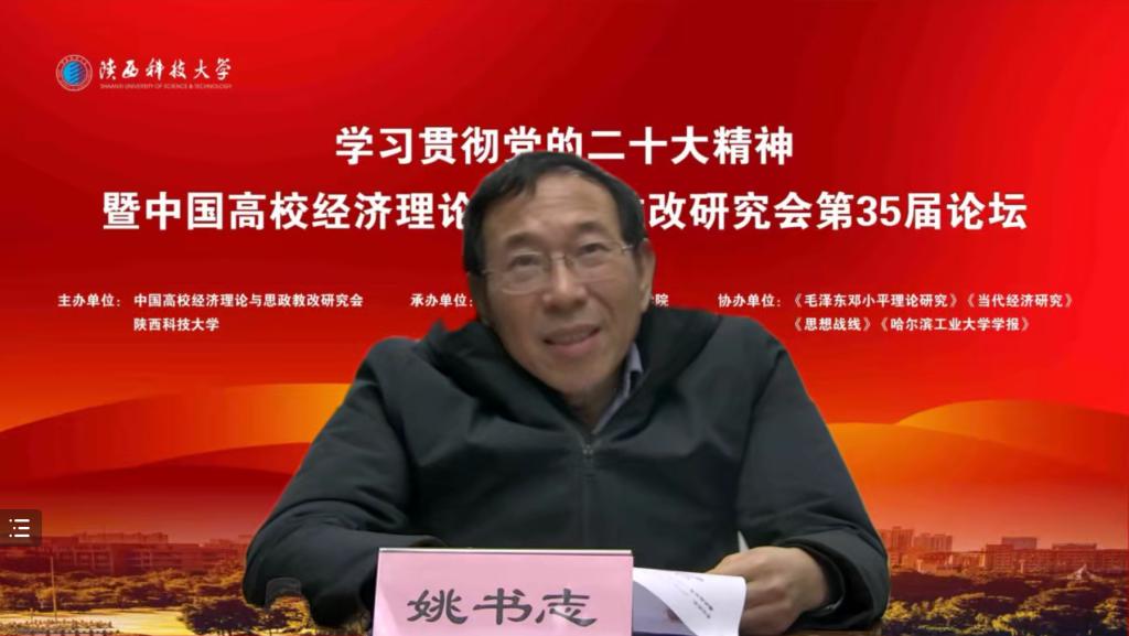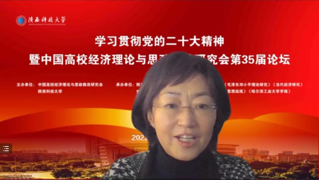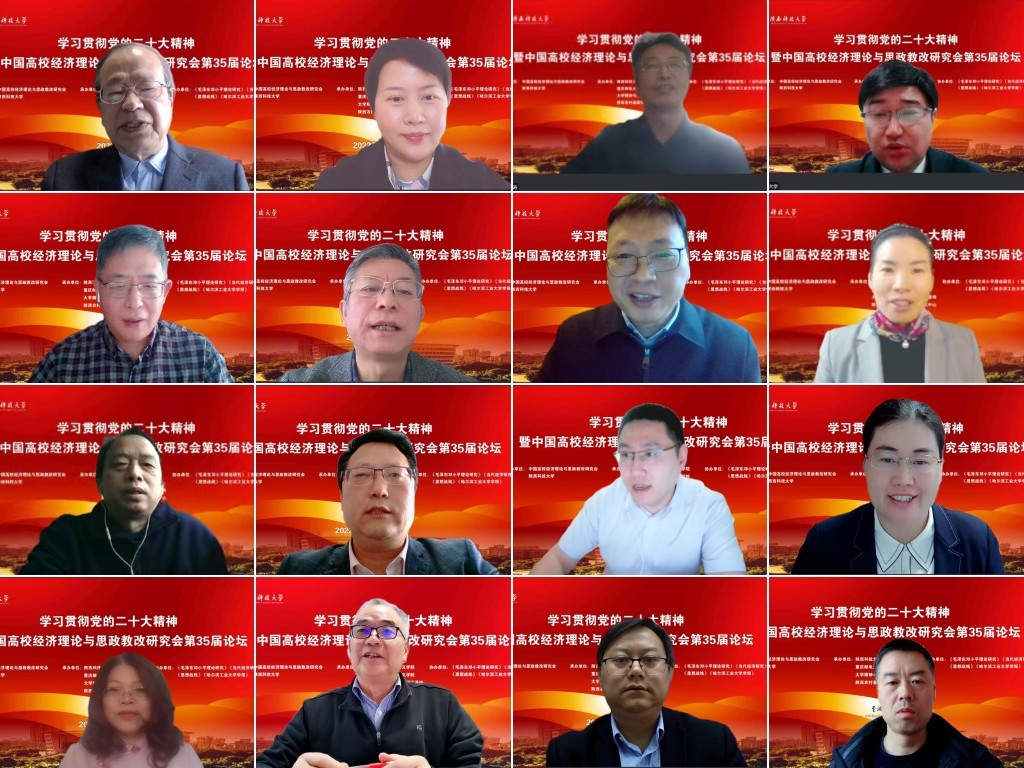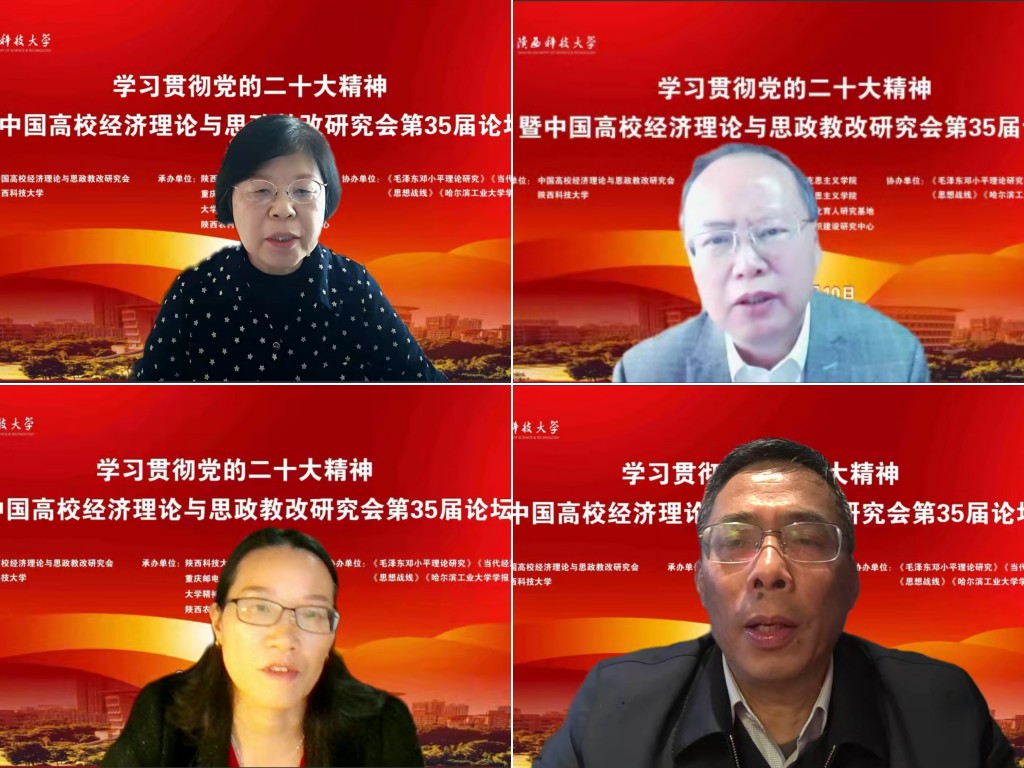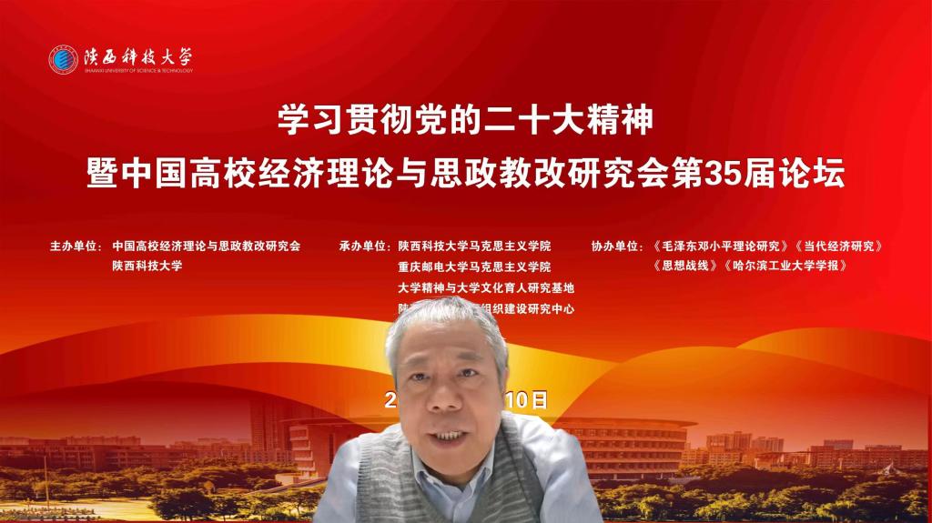 12月10日,由中國高校經(jīng)濟(jì)理論與思政教改研究會(huì)和陜西科技大學(xué)共同主辦,重慶郵電大學(xué)馬克思主義學(xué)院、大學(xué)精神與大學(xué)文化育人研究基地、陜西農(nóng)村基層黨組織建設(shè)研究中心聯(lián)合承辦的“學(xué)習(xí)貫徹黨的二十大精神暨中國高校經(jīng)濟(jì)理論與思政改革研究會(huì)第35屆論壇”成功舉辦。來自中國社會(huì)科學(xué)院、中央黨校、上海社會(huì)科學(xué)院、中國人民大學(xué)、浙江大學(xué)、武漢大學(xué)、北京師范大學(xué)、上海交通大學(xué)、西安交通大學(xué)、哈爾濱工業(yè)大學(xué)、南開大學(xué)、蘭州大學(xué)、中南大學(xué)、廈門大學(xué)、鄭州大學(xué)、重慶大學(xué)、云南大學(xué)、南京師范大學(xué)、北京理工大學(xué)、西北農(nóng)林科技大學(xué)、華中農(nóng)業(yè)大學(xué)、西安電子科技大學(xué)、陜西師范大學(xué)、貴州師范大學(xué)、長安大學(xué)、西安石油大學(xué)、北京建筑大學(xué)、福州大學(xué)、浙江理工大學(xué)、重慶郵電大學(xué)、中國民航大學(xué)、西安建筑科技大學(xué)、西安科技大學(xué)、哈爾濱理工大學(xué)、山東青年政治學(xué)院等國內(nèi)35所高校及研究機(jī)構(gòu)和《馬克思主義研究》《毛澤東鄧小平理論研究》《當(dāng)代經(jīng)濟(jì)研究》《思想戰(zhàn)線》《青海社會(huì)科學(xué)》《貴州民族研究》《哈爾濱工業(yè)大學(xué)學(xué)報(bào)》等多家知名期刊的專家學(xué)者,聚焦“中國高校經(jīng)濟(jì)理論與思政改革”主題,展開深入研討交流。