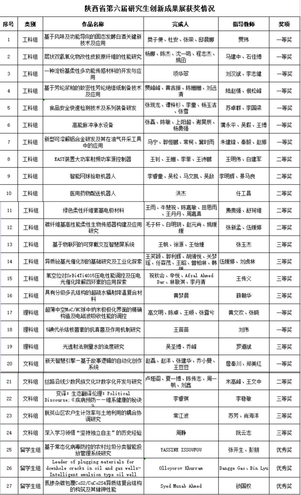 日前,由中共陜西省委教育工委、陜西省教育廳、陜西省學位委員會主辦、我校承辦的陜西省第六屆研究生創(chuàng)新成果展落下帷幕,我校在本屆研究生創(chuàng)新成果展中榮獲一等獎10項、二等獎6項、三等獎8項及優(yōu)秀獎3項,取得我校自參賽以來的最好成績。