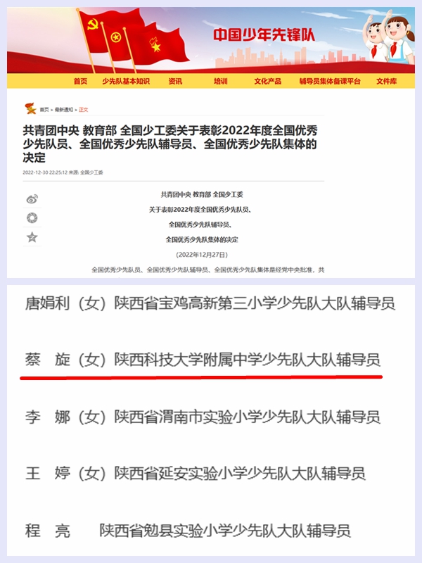 近日,共青團(tuán)中央、教育部、全國少工委公布了《關(guān)于表彰2022年度全國優(yōu)秀少先隊(duì)員、全國優(yōu)秀少先隊(duì)輔導(dǎo)員、全國優(yōu)秀少先隊(duì)集體的決定》,我校附屬中學(xué)少先隊(duì)大隊(duì)輔導(dǎo)員蔡旋被授予2022年度全國優(yōu)秀少先隊(duì)輔導(dǎo)員稱號(hào)。
