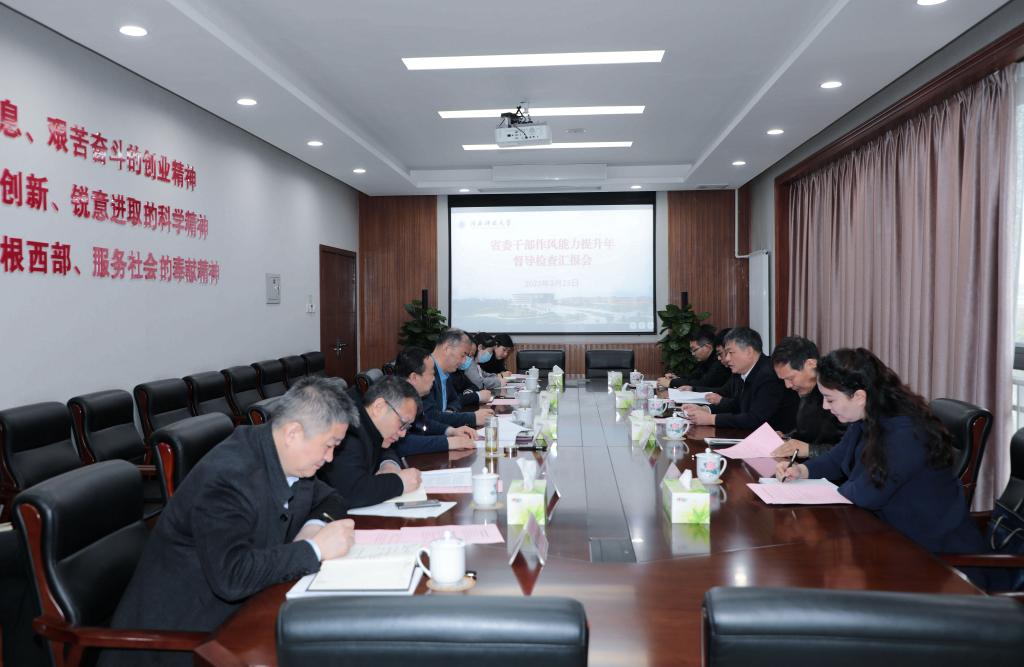 匯報(bào)會(huì)上,李志健介紹了學(xué)校基本情況及干部作風(fēng)能力提升年工作開(kāi)展情況。干部作風(fēng)能力提升年工作啟動(dòng)以來(lái),學(xué)校黨委高度重視,認(rèn)真做好頂層設(shè)計(jì),對(duì)我校干部作風(fēng)能力提升年工作做出全面安排部署,全體校領(lǐng)導(dǎo)傳閱學(xué)習(xí)相關(guān)文件、開(kāi)展校黨委理論學(xué)習(xí)中心組集體學(xué)習(xí),深入學(xué)習(xí)貫徹落實(shí)上級(jí)指示要求;學(xué)校黨委出臺(tái)《關(guān)于開(kāi)展干部作風(fēng)能力提升年活動(dòng)的實(shí)施方案》,成立工作專(zhuān)班,明確“八個(gè)方面”的重點(diǎn)任務(wù),召開(kāi)干部作風(fēng)能力提升年工作動(dòng)員會(huì),切實(shí)讓干部作風(fēng)能力提升年工作落在實(shí)處,通過(guò)全面加強(qiáng)我校干部隊(duì)伍作風(fēng)能力建設(shè),助力學(xué)校內(nèi)涵式高質(zhì)量發(fā)展;學(xué)校將干部作風(fēng)能力提升年工作融入到學(xué)校事業(yè)發(fā)展中,校領(lǐng)導(dǎo)班子成員赴省外高校調(diào)研交流,帶頭深入二級(jí)學(xué)院走訪調(diào)研,及時(shí)發(fā)現(xiàn)和解決基層學(xué)院和師生在學(xué)習(xí)、生活、工作中面臨的“急難愁盼”問(wèn)題,校院兩級(jí)領(lǐng)導(dǎo)班子成員帶隊(duì)開(kāi)展“訪企拓崗”工作,學(xué)校還通過(guò)一系列有力舉措不斷深化校地合作,促進(jìn)產(chǎn)學(xué)研用深度融合,不斷提升全校師生的獲得感和幸福感,在真抓實(shí)干中檢驗(yàn)作風(fēng)能力提升成效。李志健還匯報(bào)了學(xué)校抓實(shí)重點(diǎn)任務(wù)、抓牢宣傳引導(dǎo)、抓好作風(fēng)考核、抓嚴(yán)督促檢查的下一步工作思路。