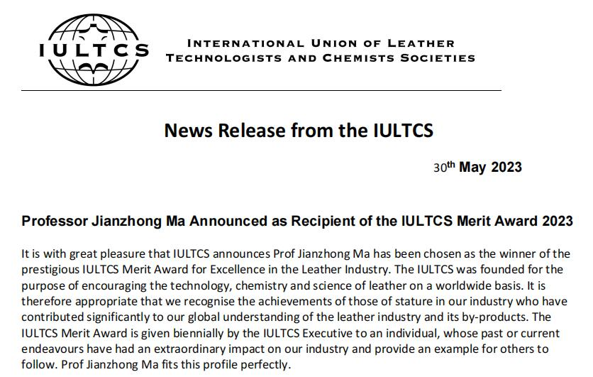 近日,國際皮革工藝師和化學(xué)家協(xié)會聯(lián)合會(IULTCS)宣布,由中國皮革協(xié)會和世界臺商皮革協(xié)會聯(lián)合推薦的我校馬建中教授榮獲2023年度國際皮革科技最高榮譽(yù)獎“IULTCS皮革行業(yè)卓越成就獎”。IULTCS是致力于促進(jìn)全球皮革技術(shù)、化學(xué)和科學(xué)發(fā)展的行業(yè)組織?!癐ULTCS皮革行業(yè)卓越成就獎”每兩年評選一次,每次評選一人。截至目前,馬建中教授是繼中國工程院石碧院士之后,第二位獲此殊榮的中國學(xué)者。此次獲獎充分體現(xiàn)馬建中教授對皮革行業(yè)的非凡影響和突出貢獻(xiàn)。