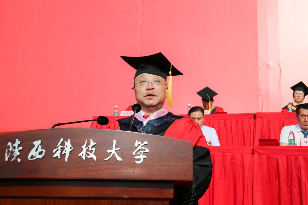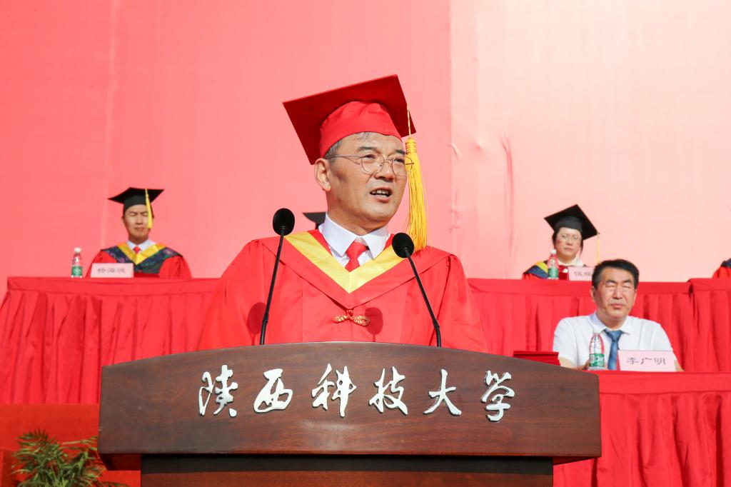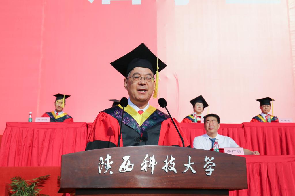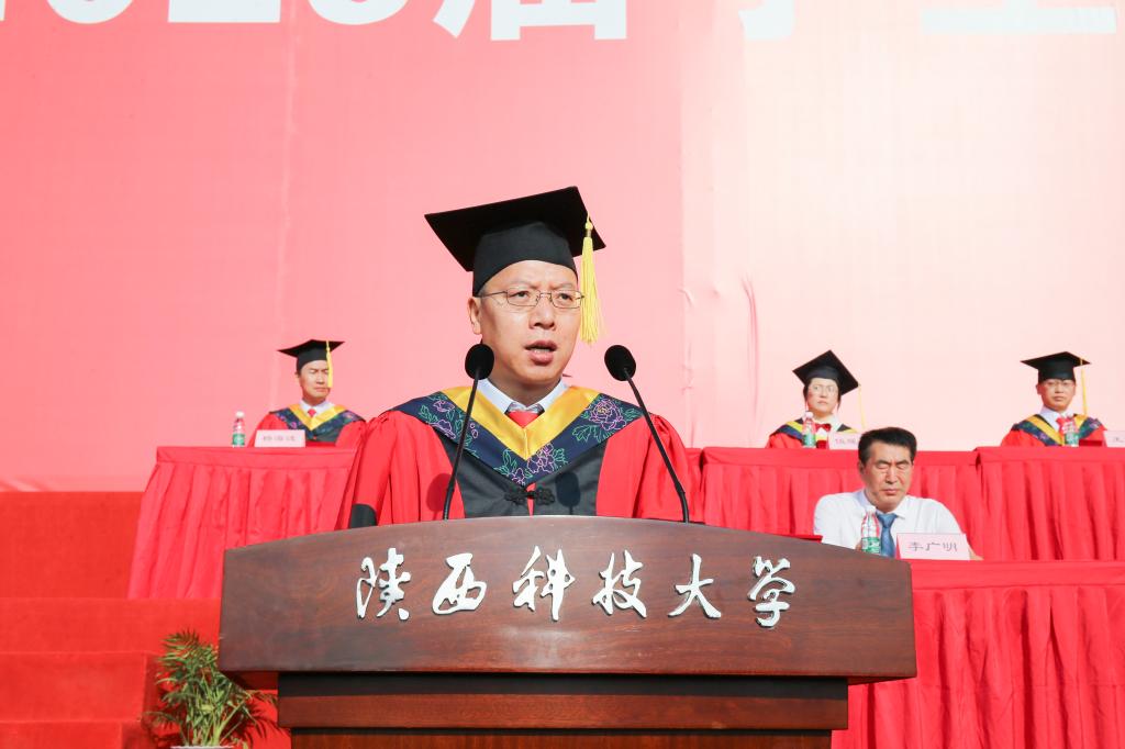 校學(xué)位評(píng)定委員會(huì)主任、校長(zhǎng)李志健以《情懷 精神 擔(dān)當(dāng)》為題,向全體畢業(yè)生送上離校前最后一課的殷殷囑托。李志健代表學(xué)校向全體畢業(yè)生圓滿完成學(xué)業(yè)表示熱烈祝賀,向辛勤付出的全體教職員工和學(xué)生家長(zhǎng)表示衷心感謝。他飽含深情地說(shuō):“你們的畢業(yè)是陜科大65周年校慶最具初心,最大、最厚重的禮物!”他回顧了過(guò)去幾年同學(xué)們以青春之朝氣致敬新中國(guó)成立70周年,以實(shí)際行動(dòng)獻(xiàn)禮中國(guó)共產(chǎn)黨百年華誕,為全面建成小康社會(huì)的偉大壯舉而歡欣鼓舞,為貫徹落實(shí)黨的二十大精神而踔厲奮發(fā),體現(xiàn)了新時(shí)代陜科大青年愛(ài)國(guó)榮校的家國(guó)情懷、融入血脈的奮斗精神、使命在肩的責(zé)任擔(dān)當(dāng)。