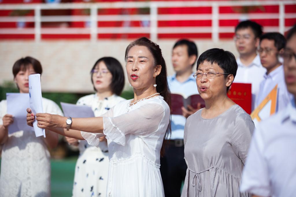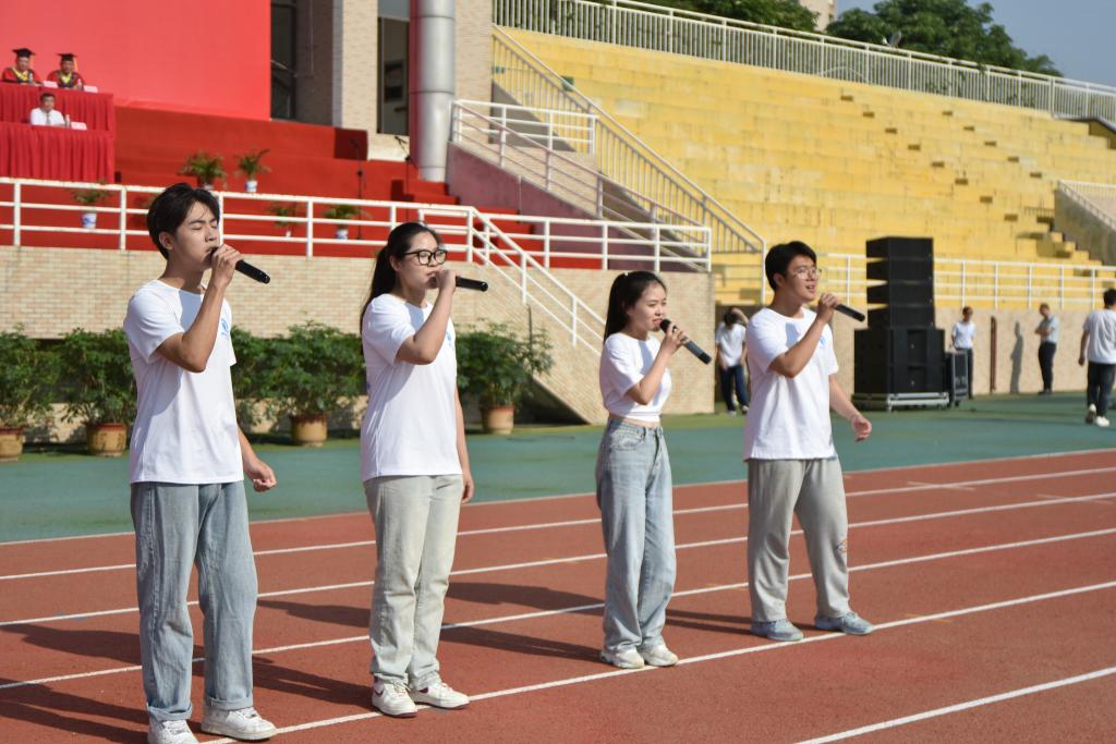 典禮開(kāi)始前,與會(huì)校領(lǐng)導(dǎo)與即將畢業(yè)的研究生代表在網(wǎng)球場(chǎng)合影留念。學(xué)子們深情演唱《星辰大?!返雀枨?,表達(dá)心中的惜別之情。