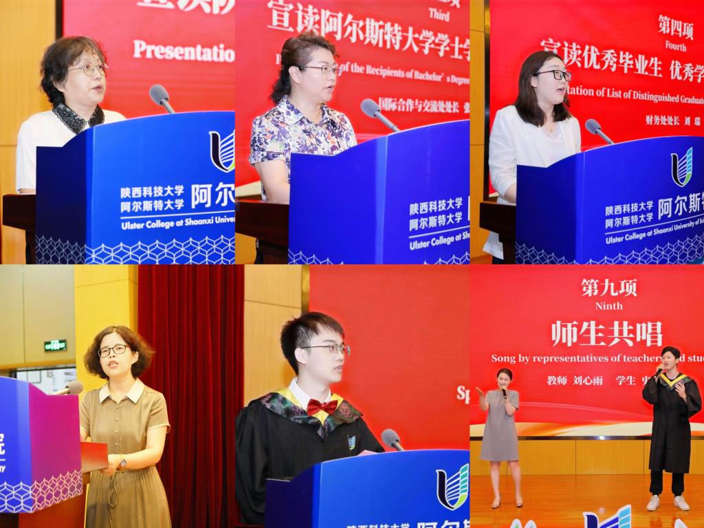 教務(wù)處副處長王芳、國際處處長張素風(fēng)分別宣讀陜西科技大學(xué)、阿爾斯特大學(xué)學(xué)士學(xué)位授予決議;財務(wù)處處長劉瑞宣讀阿爾斯特學(xué)院2023屆優(yōu)秀畢業(yè)生、優(yōu)秀學(xué)生干部名單;教師代表賀雪梅及2023屆畢業(yè)生代表馮宇分別發(fā)言;學(xué)院教師代表劉心雨、2023屆學(xué)生代表史兆龍為畢業(yè)生獻上對唱歌曲《陪你度過漫長歲月》。