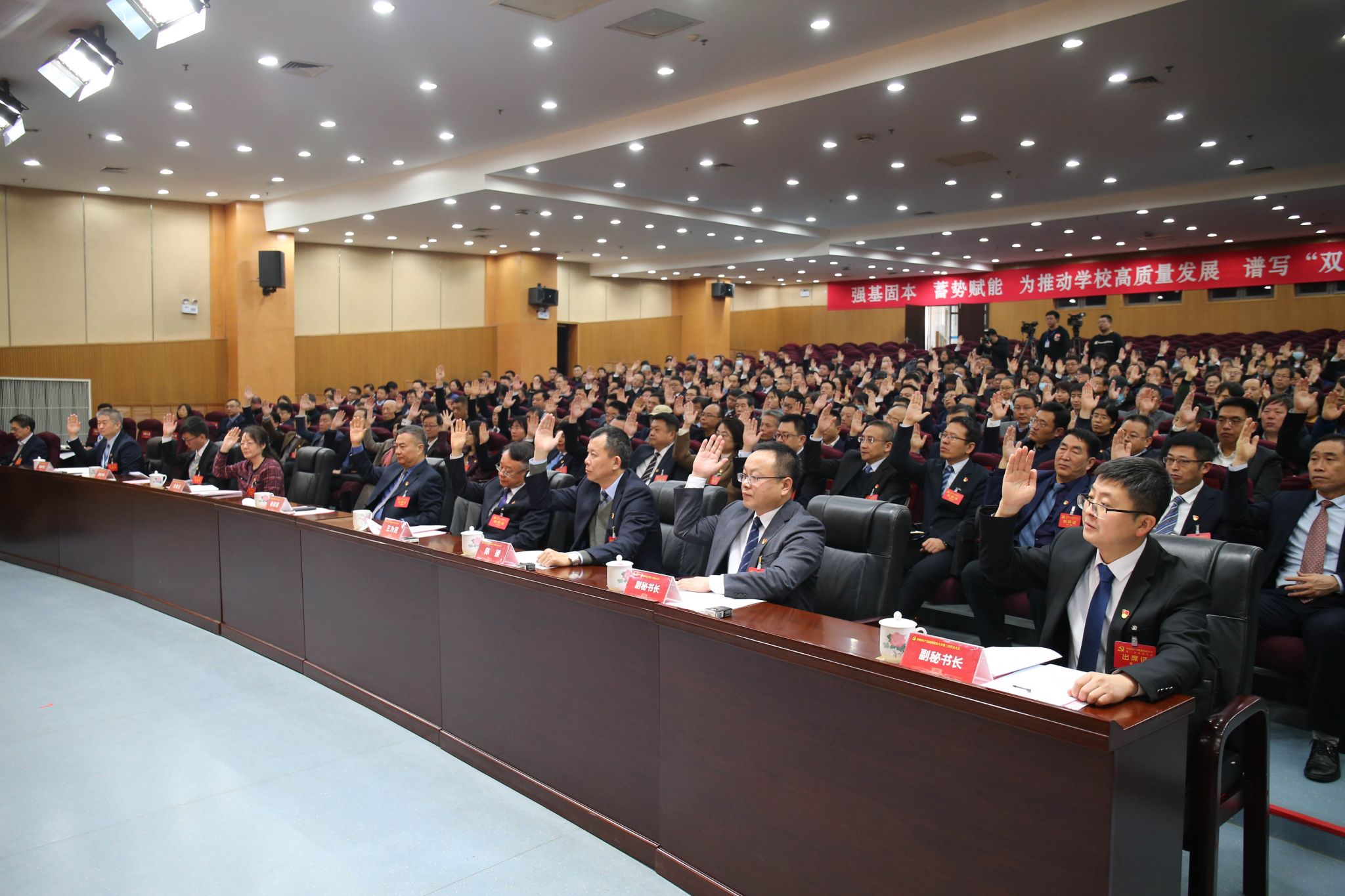 樊建武同志在大會閉幕致詞中表示,這次大會是學(xué)校在“三步走”發(fā)展戰(zhàn)略“奠基期”圓滿完成、“復(fù)興期”開局起步的重要節(jié)點召開的一次十分重要的會議,會議系統(tǒng)描繪了學(xué)校未來五年乃至更長一個時期的宏偉發(fā)展藍(lán)圖,為加快推進(jìn)“雙一流”建設(shè),推動高質(zhì)量發(fā)展,堅定了信心、指明了方向。各級黨組織要將學(xué)習(xí)宣傳貫徹學(xué)校第三次黨代會精神作為今后一個階段的重要政治任務(wù)。各單位、各部門要對照黨代會工作部署,主動認(rèn)領(lǐng)任務(wù),切實將黨代會確定的目標(biāo)任務(wù)細(xì)化實化為有力的工作舉措,堅定信心、同心同德、苦干實干、奮勇向前,以永不懈怠的精神狀態(tài)和一往無前的奮斗姿態(tài),推動學(xué)校事業(yè)實現(xiàn)更高質(zhì)量發(fā)展,奮力譜寫學(xué)?!半p一流”建設(shè)新篇章,為助力中國式現(xiàn)代化建設(shè)的陜西實踐,貢獻(xiàn)陜科大力量!