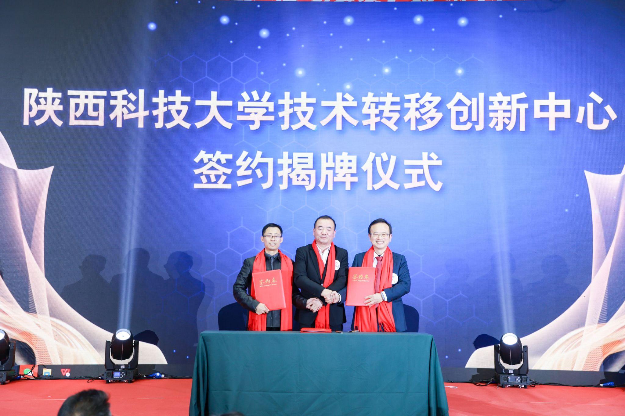 校友總會(huì)辦公室主任殷立雄、張標(biāo)、上海校友會(huì)副會(huì)長(zhǎng)兼秘書(shū)長(zhǎng)張陳斌共同簽訂《陜西科技大學(xué)技術(shù)轉(zhuǎn)移創(chuàng)新中心合作協(xié)議書(shū)》。