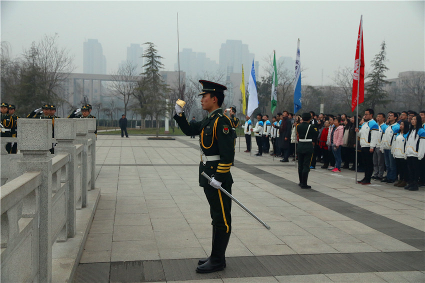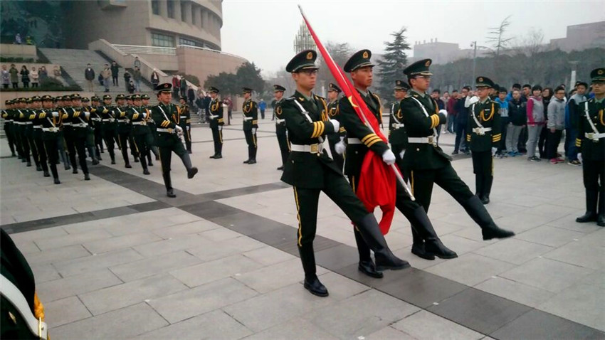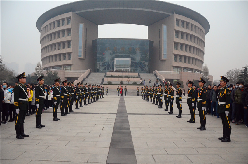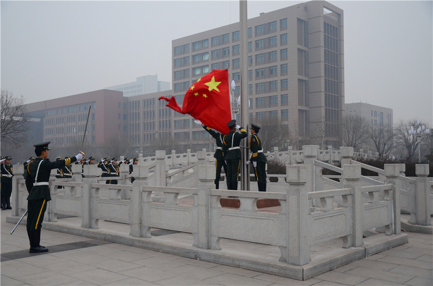 上午8點整,隨著指揮員一聲“出旗”的口令,護旗方隊邁著堅實而雄健的步伐,精神抖擻地護衛(wèi)著國旗走向國旗臺?!吧龂欤喑獓琛币宦暳钕?,伴隨著雄壯的義勇軍進行曲和嘹亮的國歌聲,五星紅旗冉冉升起。全體師生深情注視,向國旗致以莊嚴的敬禮,共同慶祝新年的到來,祝愿偉大祖國日益繁榮富強,祝愿學(xué)校在新年里開創(chuàng)更加美好的明天。我校國旗護衛(wèi)隊隊員、材料學(xué)院學(xué)生代表武慕侖做國旗下演講,號召青年學(xué)子將愛國熱情轉(zhuǎn)化為實際行動,從自身做起,上好每一節(jié)課,做好每一次作業(yè),走好新一代人的長征路。