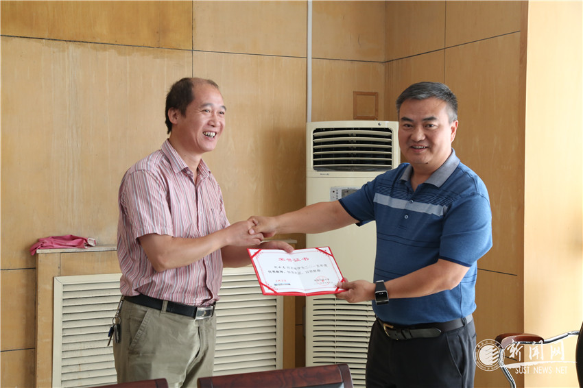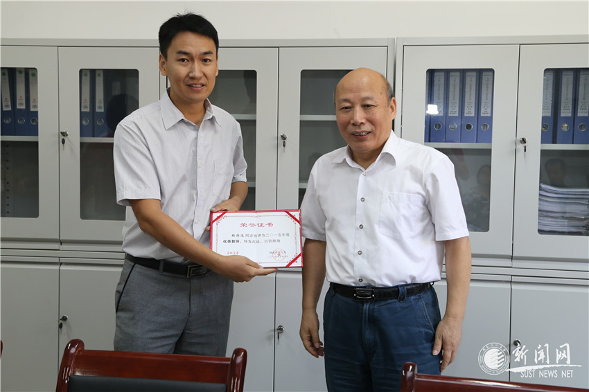 校黨委書記潘中偉(右一)為材料學(xué)院獲獎(jiǎng)教師頒發(fā)榮譽(yù)證書