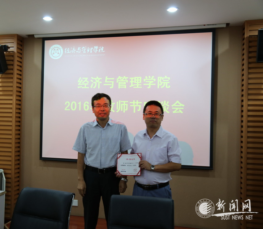 副校長(zhǎng)郭霄鵬(左一)為經(jīng)管學(xué)院獲獎(jiǎng)教師頒發(fā)榮譽(yù)證書