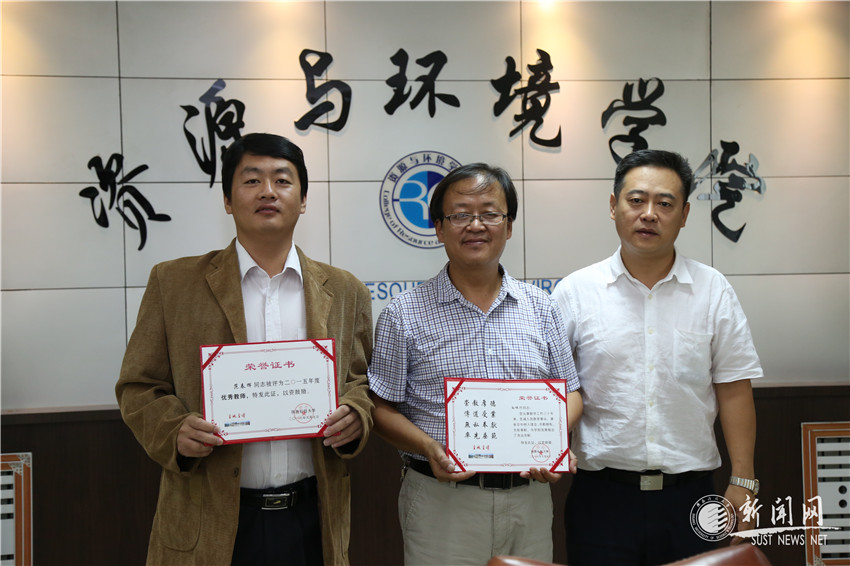 副校長(zhǎng)蔡煜東(右一)為環(huán)境學(xué)院獲獎(jiǎng)教師頒發(fā)榮譽(yù)證書