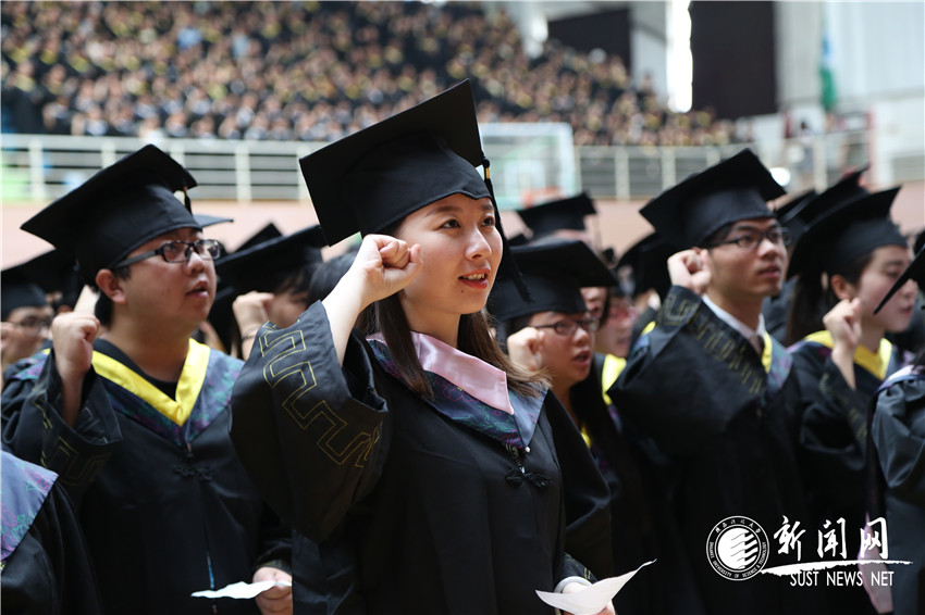 “秉承至誠至博校訓,銘記師長教誨,弘揚科大精神,團結(jié)勤奮、求實創(chuàng)新,用才華和智慧肩負起民族復興的使命,用青春和熱血承擔起國家富強的責任。今日我以科大為榮,明日科大以我為榮!”全體畢業(yè)生的朗朗誓言響徹全場,畢業(yè)典禮在承載著希望和祝福中落下帷幕。