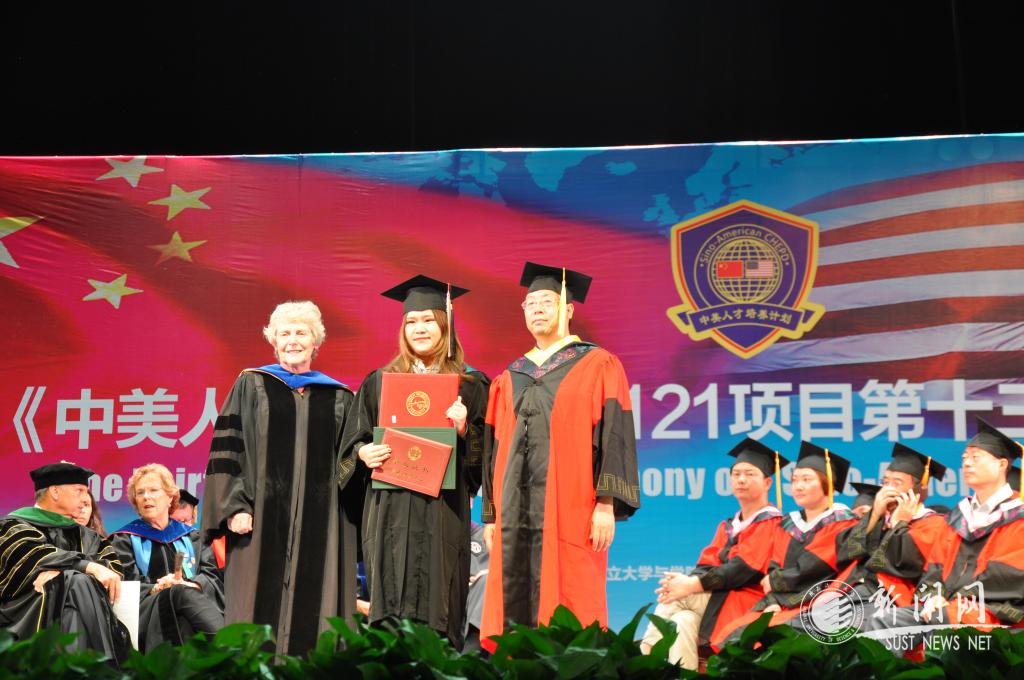 教務(wù)處處長(zhǎng)鄭恩讓在年會(huì)上與美國(guó)東華盛頓大學(xué)教務(wù)長(zhǎng)琳達(dá)·凱菲爾女士共同為我校輕工科學(xué)與工程學(xué)院包裝工程專(zhuān)業(yè)12級(jí)雍樂(lè)同學(xué)頒授中美雙學(xué)位畢業(yè)證和學(xué)位證書(shū),雍樂(lè)也是我校首位121項(xiàng)目畢業(yè)生。據(jù)了解,在本屆121項(xiàng)目210多名畢業(yè)生中,雍樂(lè)同學(xué)獲評(píng)“2016年度優(yōu)秀畢業(yè)生”。