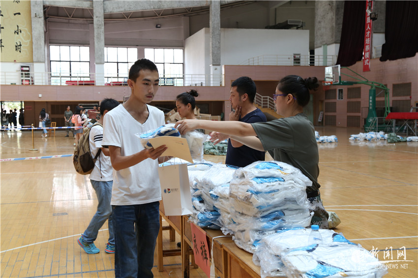 在迎新大道上,校領(lǐng)導(dǎo)一行先后來到各學(xué)院(部)迎新點(diǎn)一一慰問。每到一處,姚校長都會關(guān)切地詢問:“報了多少人了?”、“手續(xù)辦理快不快,需不需要排隊(duì)?”,并了解暑假期間有關(guān)學(xué)院開展的專業(yè)認(rèn)證、評估等工作情況,同時不忘殷殷叮囑工作人員和學(xué)生志愿者:“天比較熱,大家要注意身體?!痹谖捏w館的服裝發(fā)放點(diǎn),姚校長戴上要發(fā)給新生的印有?;盏拿弊樱惺芰艘幌率孢m度;又摸摸新生即將在軍訓(xùn)中穿的迷彩短袖,點(diǎn)點(diǎn)頭:“在這個天氣,穿這個比較涼快。”