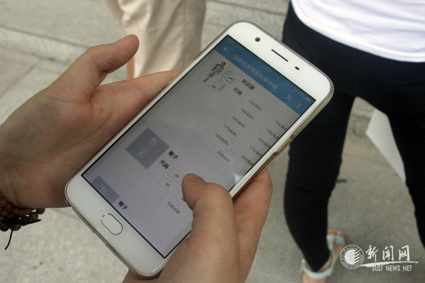 位于文體館發(fā)放軍訓(xùn)服點(diǎn),來自設(shè)計與藝術(shù)學(xué)院的新生毛蕊給記者演示了她如何在易班上預(yù)訂服裝的過程:登陸易班、選擇自助報到頁面、進(jìn)入服裝預(yù)訂系統(tǒng),即可提前網(wǎng)上選擇?!罢嬲媸欠奖阌挚旖莅?!”毛蕊說。