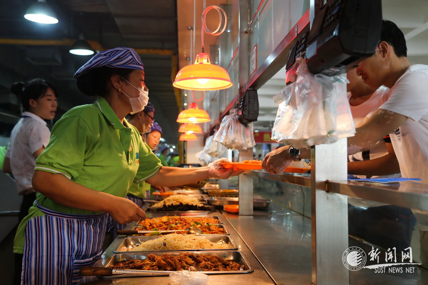 熱鬧的餐廳中,科大的“新鮮血液”們已經(jīng)到了他們的午餐時間,與家人一起在科大的餐廳中吃上來科大的第一頓飯,幸福的笑容寫在他們臉上。為保證新生和家長們順利、開心的用餐,飲食中心在三天前就開始了一系列準(zhǔn)備,而今天也是從早上五點(diǎn)就已經(jīng)開始了加工工作。并且今天開放了沁園一、二、清真、接待四個餐廳,并配備有兩名專職監(jiān)督員,監(jiān)控飲食安全與衛(wèi)生,為新生的飲食健康保駕護(hù)航。