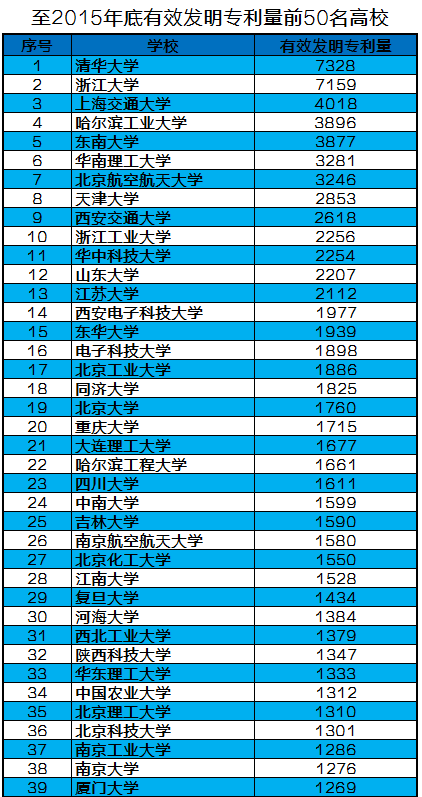 至2015年底高校有效發(fā)明專利量前50名:http://www.cutech.edu.cn/cn/zscq/2016/02/1455730697907527.htm